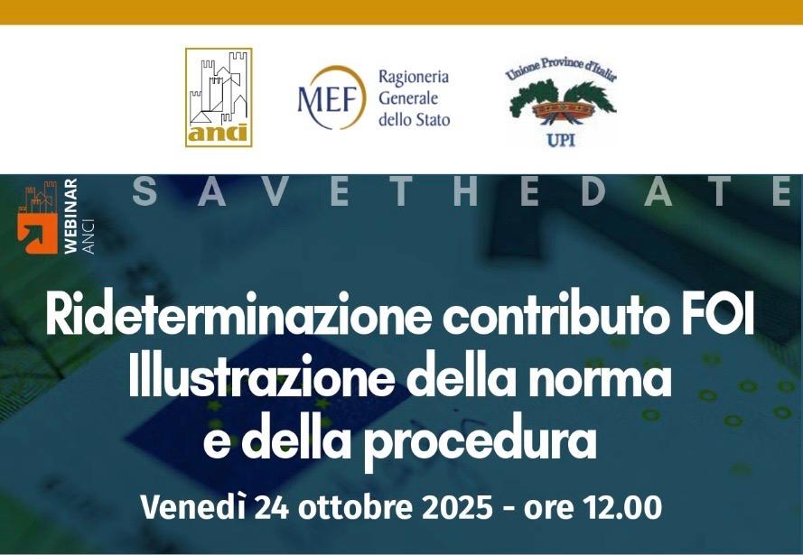 Si terrà venerdì 24 ottobre 2025 alle ore 12:00 il webinar ANCI – UPI – MEF dedicato alla rideterminazione del contributo FOI. L’incontro avrà l’obiettivo di illustrare agli enti il perimetro di applicazione della norma e le funzionalità operative della procedura.